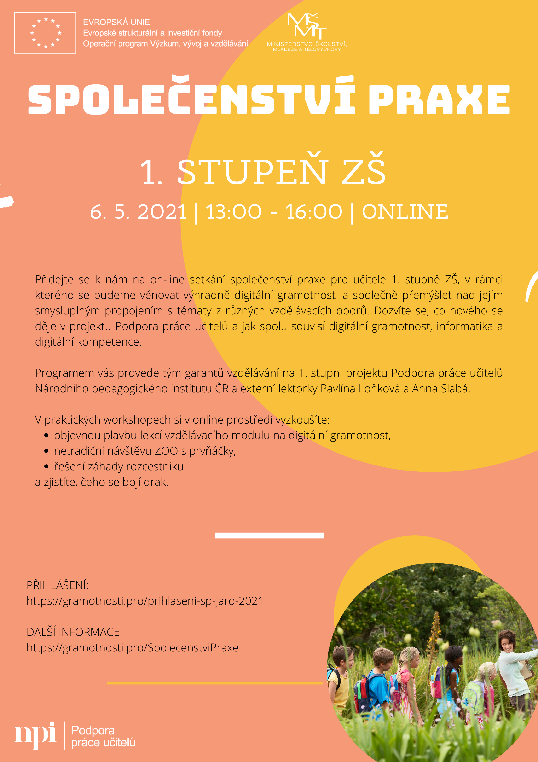 Přidejte se k nám na on-line setkání společenství praxe pro učitele 1. stupně ZŠ, v rámci kterého se budeme věnovat výhradně digitální gramotnosti a společně přemýšlet nad jejím smysluplným propojením s tématy z různých vzdělávacích oborů. Dozvíte se, co nového se děje v projektu Podpora práce učitelů a jak spolu souvisí digitální gramotnost, informatika a digitální kompetence.