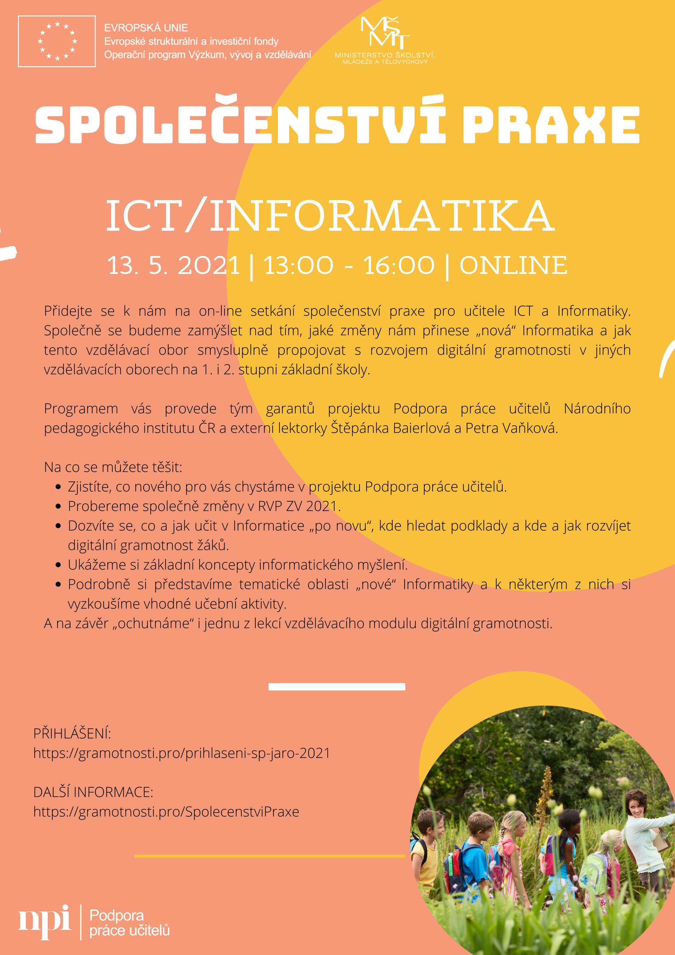 Přidejte se k nám na on-line setkání společenství praxe pro učitele ICT a Informatiky. Společně se budeme zamýšlet nad tím, jaké změny nám přinese „nová“ Informatika a jak tento vzdělávací obor smysluplně propojovat s rozvojem digitální gramotnosti v jiných vzdělávacích oborech na 1. i 2. stupni základní školy.